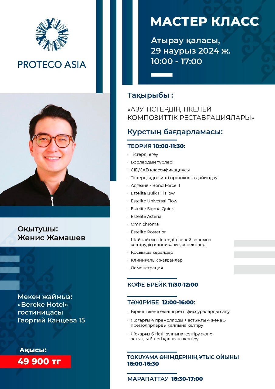 Учебный центр компании Протеко Азия, специализирующийся на современных методиках стоматологического обучения, проведет семинар-практикум для стоматологов на казахском языке в городах Актау и Атырау с выдающимся лектором Женисом Жамашевым.